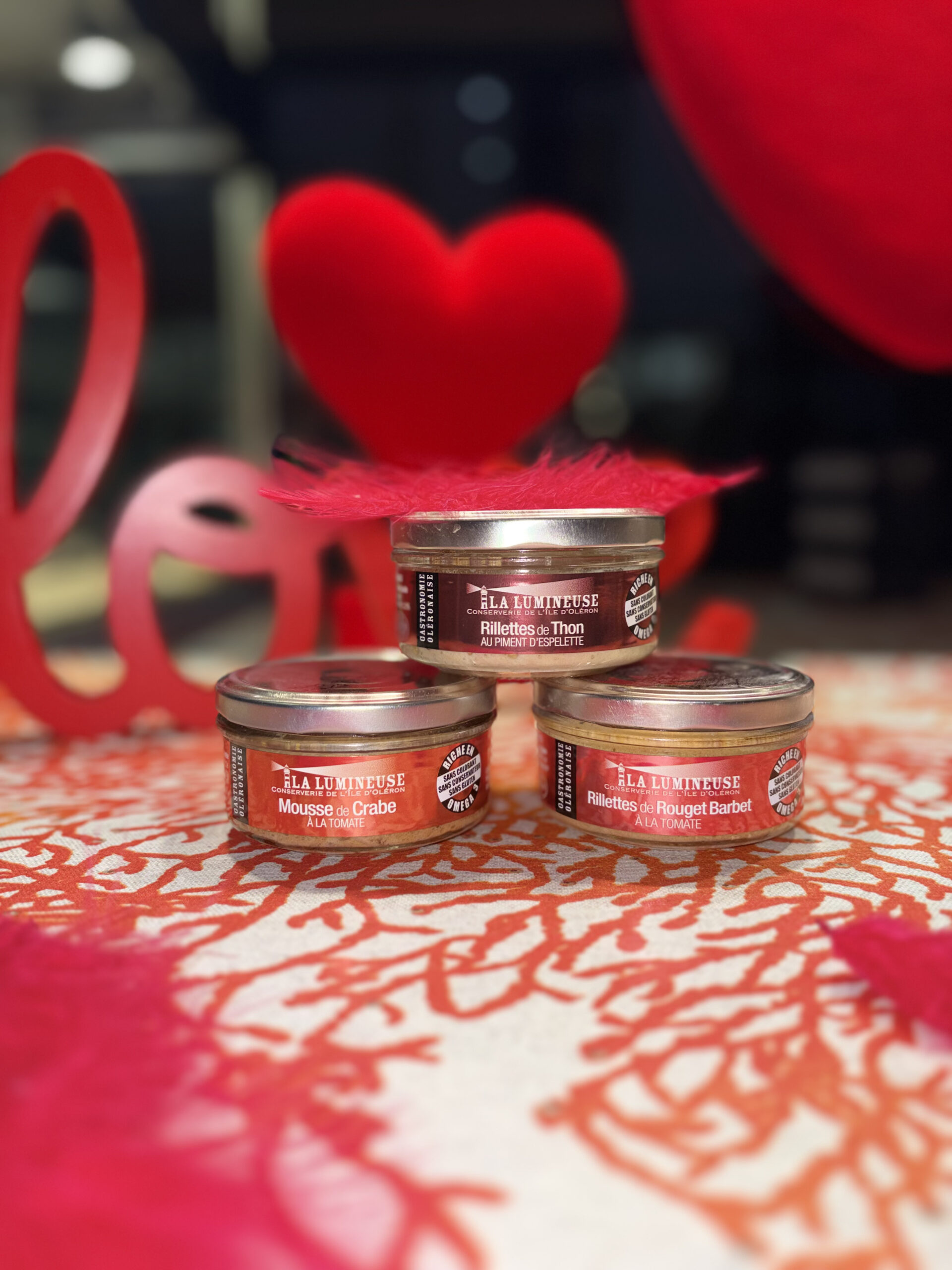 Coffret Saint-Valentin : Rillettes de Thon au Piment d’Espelette, Mousse de Crabe à la Tomate, Rillettes de Rouget Barbet à la Tomate une attention idéale pour faire plaisir — ou se faire plaisir 💌